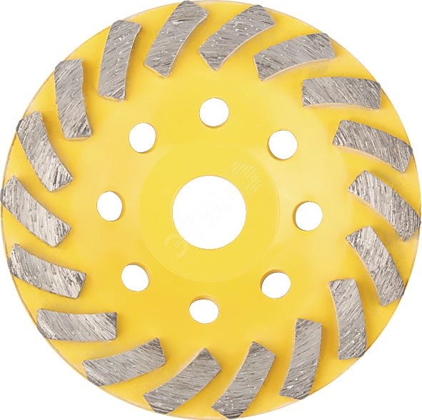 Турбо-сегмент'. Для углошлифовальных машин. Посадочный диаметр 22,2 мм. Удобен для выравнивания кромки, шлифовки, и полировки бетона, гранита, мрамора и аналогичных строительных материалов. Подходит для тонкой обработки. Материал - инструментальная сталь, режущая кромка содержит порошок из технических алмазов. Упаковка - картонная коробка .