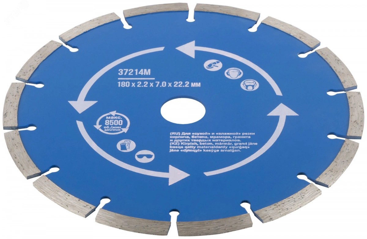 Сегментный. Для использования с УШМ . Посадочный диаметр 22,2мм. Для 'сухой' и 'влажной' резки кирпича, бетона, мрамора, гранита и других твердых материалов. Сегментная режущая кромка обеспечивает охлаждение диска в процессе работы, предотвращая его перегрев. Материал - инструментальная сталь, режущая кромка-расплав с техническими алмазами. Уп - Блистер