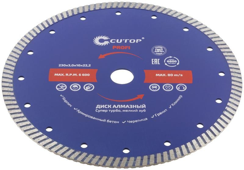В нашем интернет-магазине вы можете купить Диск отрезной алмазный сверхтонкий супер-турбо мелкий зуб 230х3.0х10х22.2мм Cutop 65-23030 в Екатеринбурге, артикул 65-23030. Чтобы уточнить условия оплаты, доставки и действующие скидки на товар, свяжитесь с нашим менеджером по телефону +7 (343) 266-30-88.