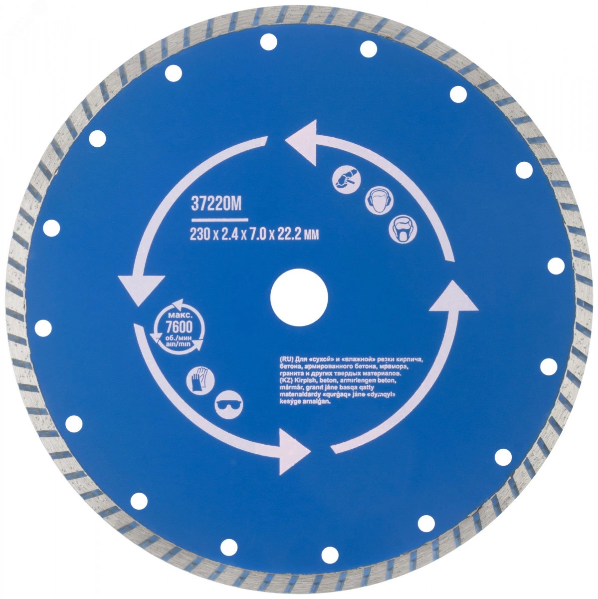 Турбосегментный. Для использования с УШМ. Посадочный диаметр 22,2 мм. Для «сухой» и «влажной» резки кирпича, бетона, армированного бетона, мрамора, гранита и других твердых материалов. Сегментная алмазная режущая кромка, с ''турбо'' профилем высотой 10 мм, увеличивает скорость реза и способствует более эффективному удалению отработанного материала, предотвращая перегрев диска. Материал - инструментальная сталь, режущая кромка - расплав с техническими алмазами. Упаковка - блистер.