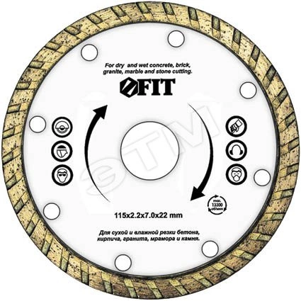 Турбо'. Для сухой и влажной резки. Универсальный. Применяется для резки бетона, кирпича, гранита, мрамора и камня. Высота алмазной режущей кромки 7,5 мм. Посадочный диаметр 22,2 мм. Материал - высококачественная инструментальная сталь, режущая кромка содержит порошок из-технических алмазов. Упаковка - картонный конверт.