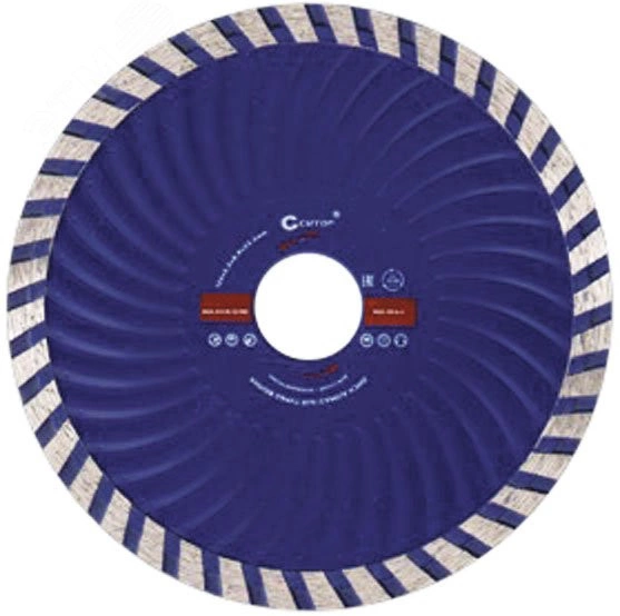 Турбо-волна. Универсальный. Для сухой и влажной резки бетона, кирпича, гранита, мрамора и камня. Усиленная конструкция. Посадочный диаметр 22,2 мм. Инструментальная сталь, режущая кромка содержит порошок из технических алмазов. Упаковка - картонный конверт.
