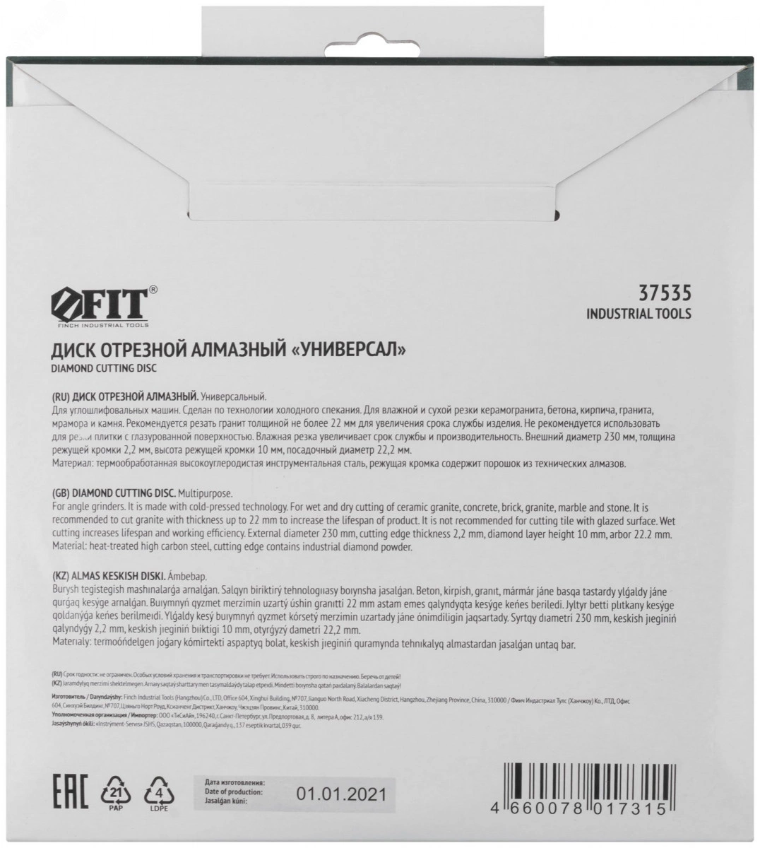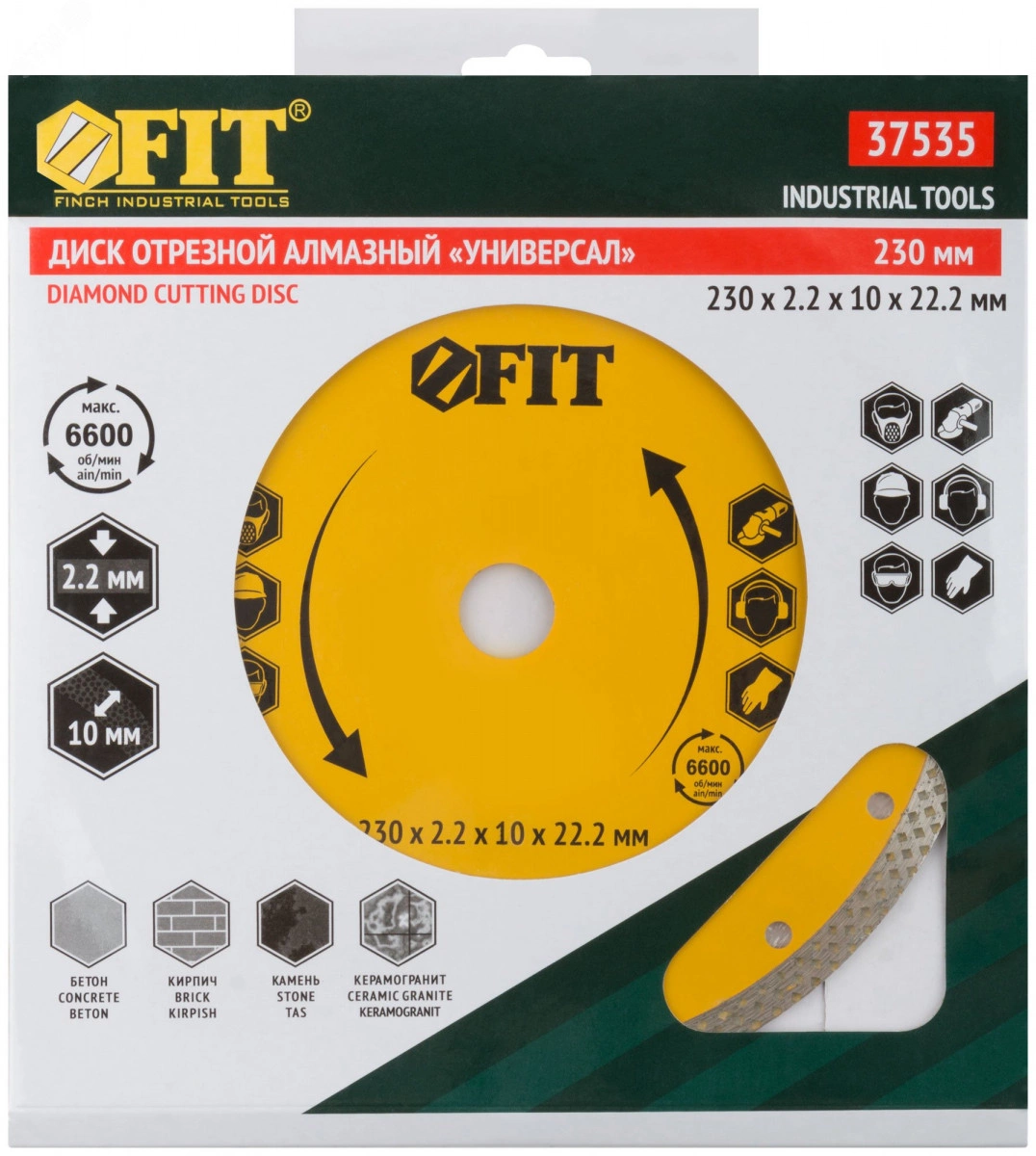 Универсальный. Для влажной и сухой резки керамогранита, бетона, кирпича, гранита, мрамора и камня. Посадочный диаметр 22,2 мм. Высота алмазной кромки 10 мм. Материал - инструментальная сталь, режущая кромка содержит порошок из технических алмазов . Упаковка - картонный конверт.