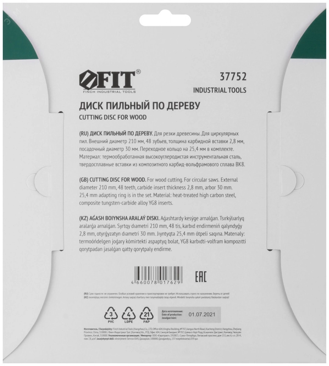 Диск пильный для циркулярных пил по дереву 210 х 30/25.4 х 48T