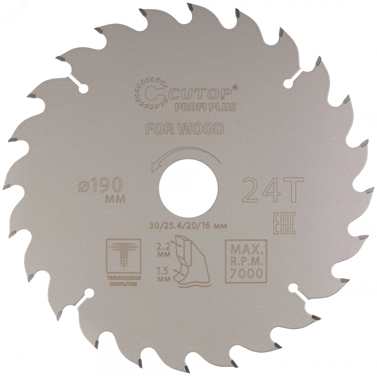 Диск пильный по дереву с тефлоновым покрытием 24Т, Profi plus, 190 х 1,5/2,2 х 30/25,4/20/16 мм