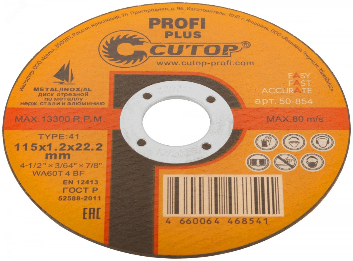 Отрезной диск по металлу, нержавеющей стали и алюминию Cutop SPECIAL предназначен для использования с УШМ. Диск показывает лучший результат при резке металлочерепицы, листового профиля и тонкостенной профильной трубы. Благодаря уникальной технологии армирования стеклотканевой сеткой в четыре слоя для дисков диаметром 230 мм и в два слоя для дисков диаметром 125 мм, диск выдерживает значительные нагрузки на изгиб при своей малой толщине и обеспечивает высокие показатели безопасности. Отсутствие вибрации позволяет достичь высокой точности реза. Монокристаллический электрокорунд, входящий в состав диска, увеличивает многократно КПД диска.