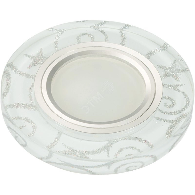 Полное описание: DLS-L202 GU5.3 CHROME/WHITE Светильник декоративный встраиваемый, серия Luciole. Без лампы. Доп.подсветка 3Вт. Металл, цвет хром. Отделка стекло белое с серебром. ТМ Fametto.