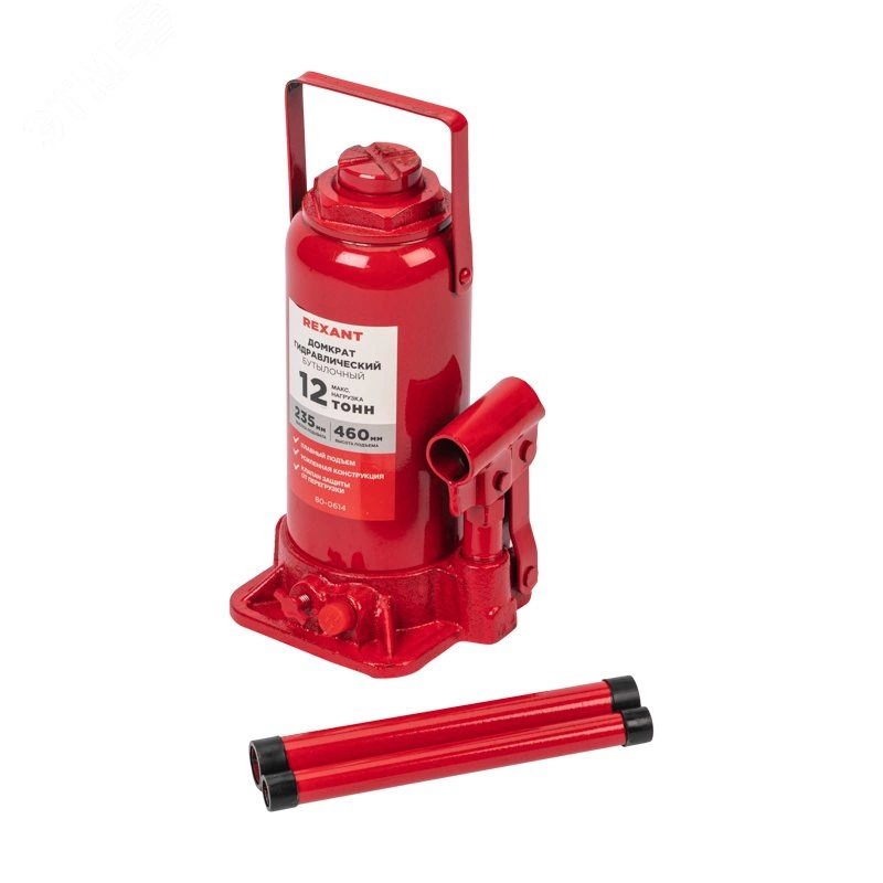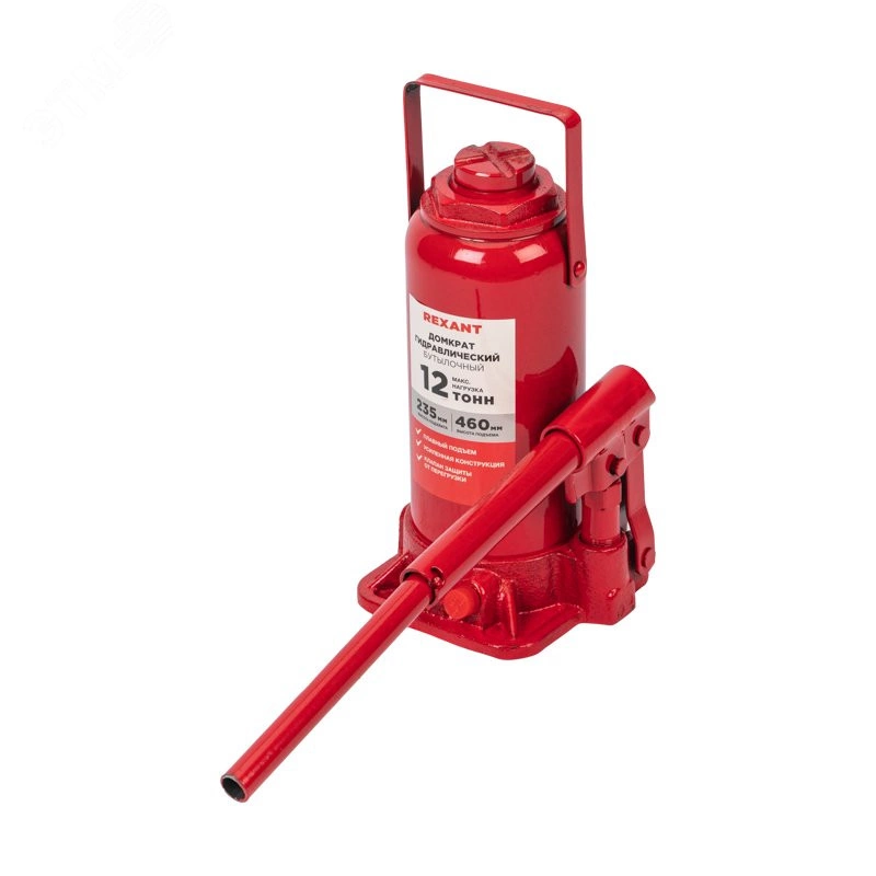 Гидравлический бутылочный домкрат 12 т Rexant поднимает грузы массой до 12 тонн на высоту до 460 мм. Оптимален для автомобилей с большим клиренсом. Будет полезен автолюбителям при проведении технического обслуживания и ремонта, а также для профессионалов на СТО. Отличается плавностью хода, надежностью и жесткостью конструкции. Клапан безопасности не дает поднимать груз тяжелее 12 т, предохраняя домкрат от поломки. Максимальная нагрузка - 12 т. Высота подхвата - 235 мм. Высота подъема - 460 мм. Материал корпуса - сталь, чугун.