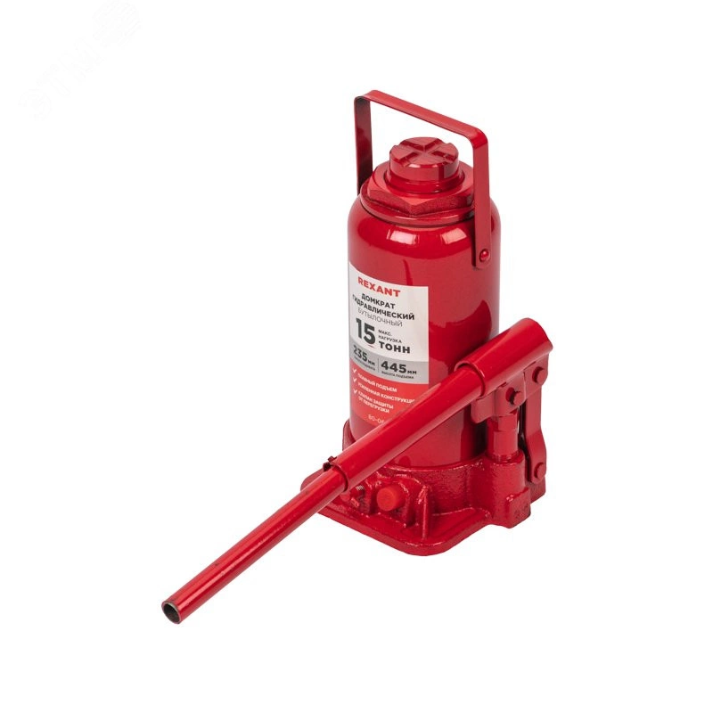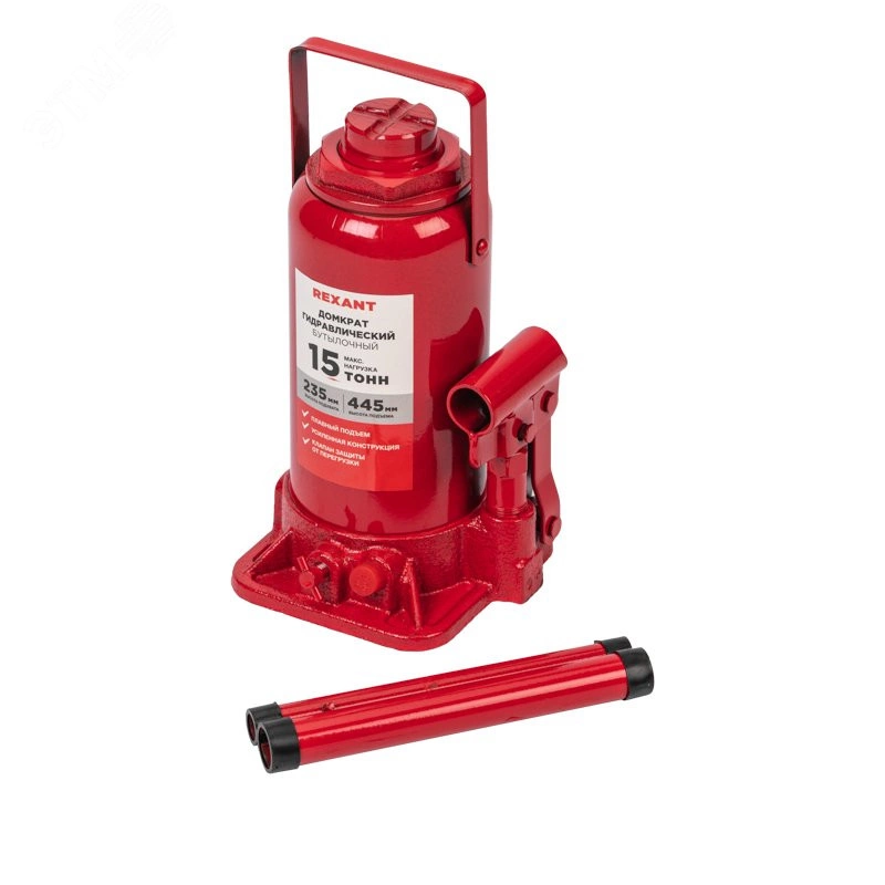 Гидравлический бутылочный домкрат 15 т Rexant поднимает грузы массой до 15 тонн на высоту до 445 мм. Оптимален для автомобилей с большим клиренсом. Будет полезен автолюбителям при проведении технического обслуживания и ремонта, а также для профессионалов на СТО. Отличается плавностью хода, надежностью и жесткостью конструкции. Клапан безопасности не дает поднимать груз тяжелее 15 т, предохраняя домкрат от поломки. Максимальная нагрузка - 15 т. Высота подхвата - 235 мм. Высота подъема - 445 мм. Материал корпуса - сталь, чугун.