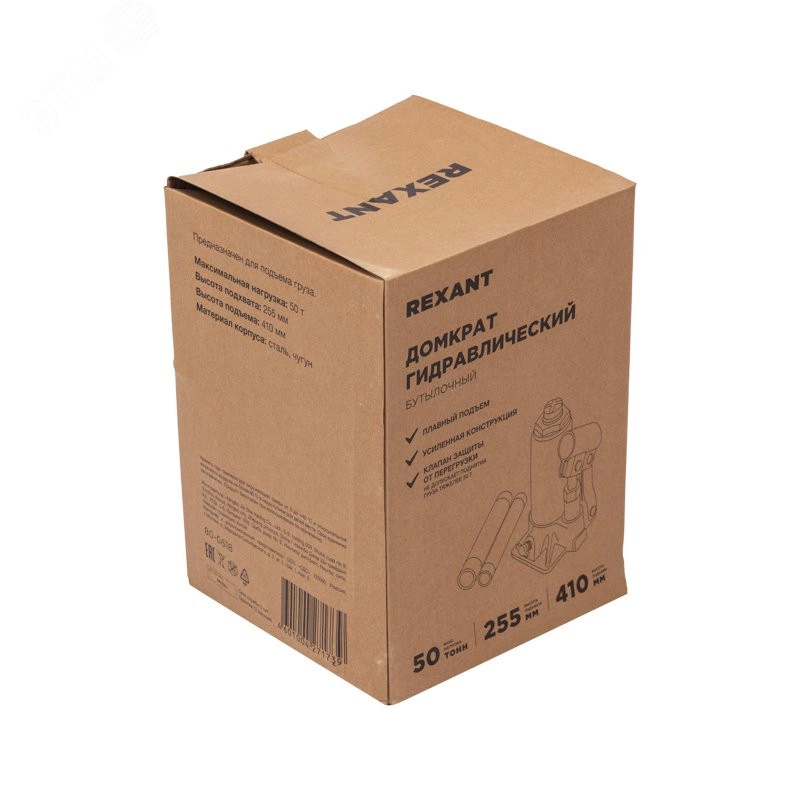 Гидравлический бутылочный домкрат 50 т Rexant поднимает грузы массой до 50 тонн на высоту до 356 мм. Оптимален для автомобилей с большим клиренсом. Будет полезен автолюбителям при проведении технического обслуживания и ремонта, а также для профессионалов на СТО. Отличается плавностью хода, надежностью и жесткостью конструкции. Клапан безопасности не дает поднимать груз тяжелее 50 т, предохраняя домкрат от поломки. Максимальная нагрузка - 50 т. Высота подхвата - 255 мм. Высота подъема - 410 мм. Материал корпуса - сталь, чугун.
