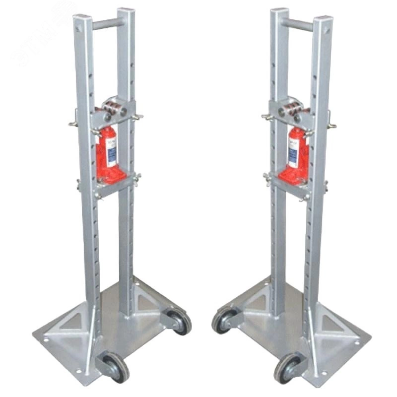 Гидравлическая система для отмотки кабеля с барабана при проведении работ на строительных и монтажных площадках, в производственных цехах, значительно упрощает и ускоряет процесс монтажа кабельных линий. Ось домкрата выполнена из толстостенной трубы и оснащена прижимными хомутами для исключения перемещения барабана по валу во время размотки кабеля. Максимальный вес барабана - 3 т. Максимальная нагрузка на стойки - 30 кН. Максимальная нагрузка на ось - 30 кН. Номера барабанов - от №6 до №18. Специальные отверстия по всей высоте стоек позволяют быстро настроить высоту оси под размер барабана. Стойки домкрата имеют подшипниковые узлы, центрирующие ось, обеспечивая вращение под нагрузкой с меньшим сопротивлением. Узел фиксации подшипникового узла препятствует случайному повреждению домкрата при чрезмерном подъеме. Рабочая температура - 20 до +40 градусов по Цельсию. Стойки домкрата оснащены колесами для более удобного перемещения по поверхности.