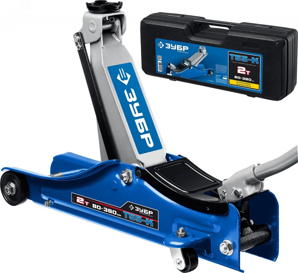 Домкрат Т-55-K 2т 80-380мм подкатной с увеличенным подъемом и низким подхватом в кейсе, Профессионал