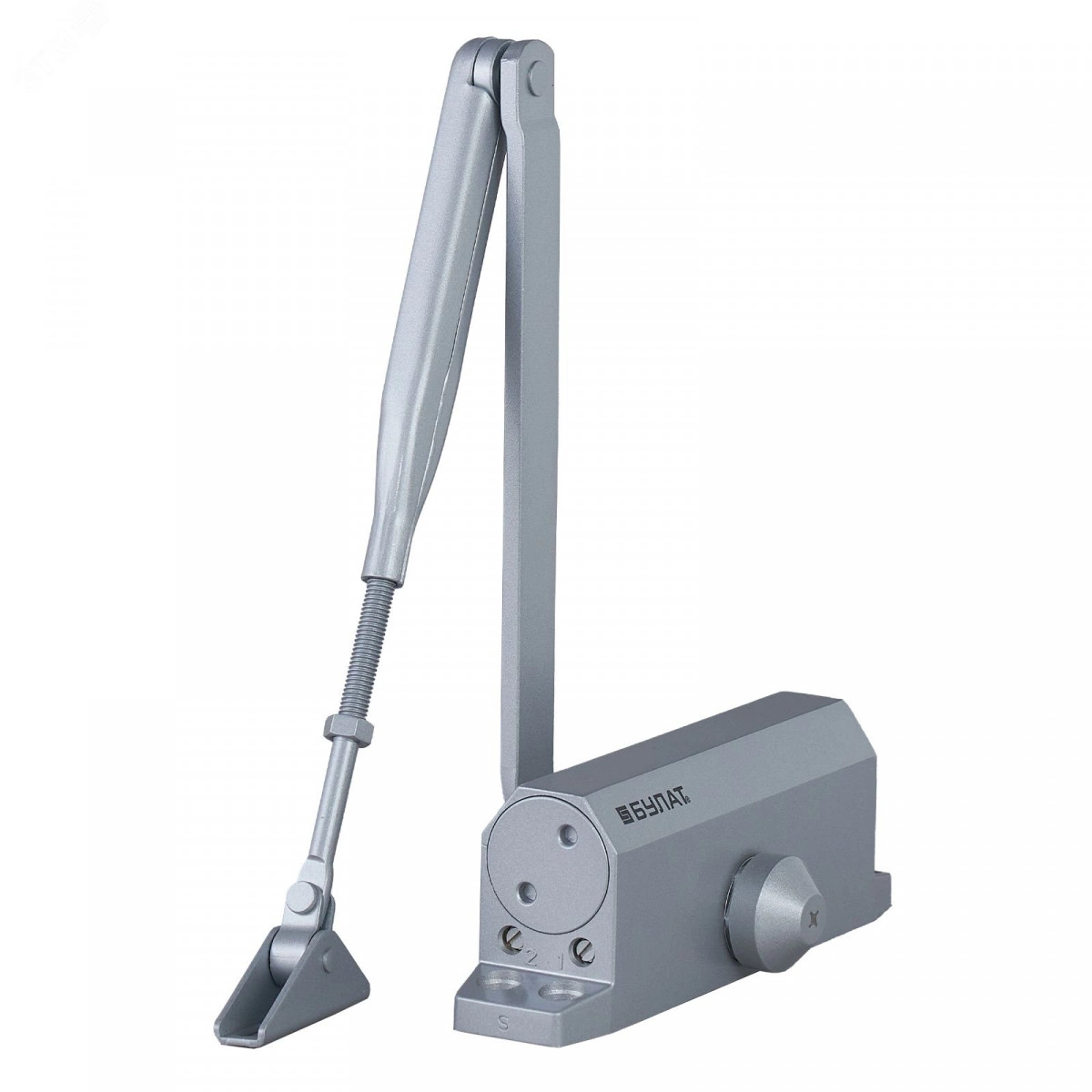 БУЛАТ Доводчик дверной ARCTIC ДД 502/4 A-S (60-120 кг) серебро, морозостойкий (10). Дверные доводчики ''БУЛАТ'', предназначены для плавного, автоматического закрытия двери. Подходит для большинства пластиковых, деревянных и металлических дверей. Устанавливаются в квартирах, офисах, промышленных и других помещениях. Функции - регулируемая скорость закрывания двери, регулируемая скорость окончательной доводки. Универсальный установочный размер в серии легких доводчиков (162-168 мм ) за счет овальных отверстий в корпусе. Модель подходит для дверей весом до 120 кг при угле открывания 135 градусов и для дверей весом 60-85 кг при угле открывания 180 градусов. Комплект поставки Дверной доводчик Рычаг с шарнирным разъемным соединением колена Крепеж Инструкция по монтажу и эксплуатации, совмещенная с паспортом изделия Шаблон для установки.