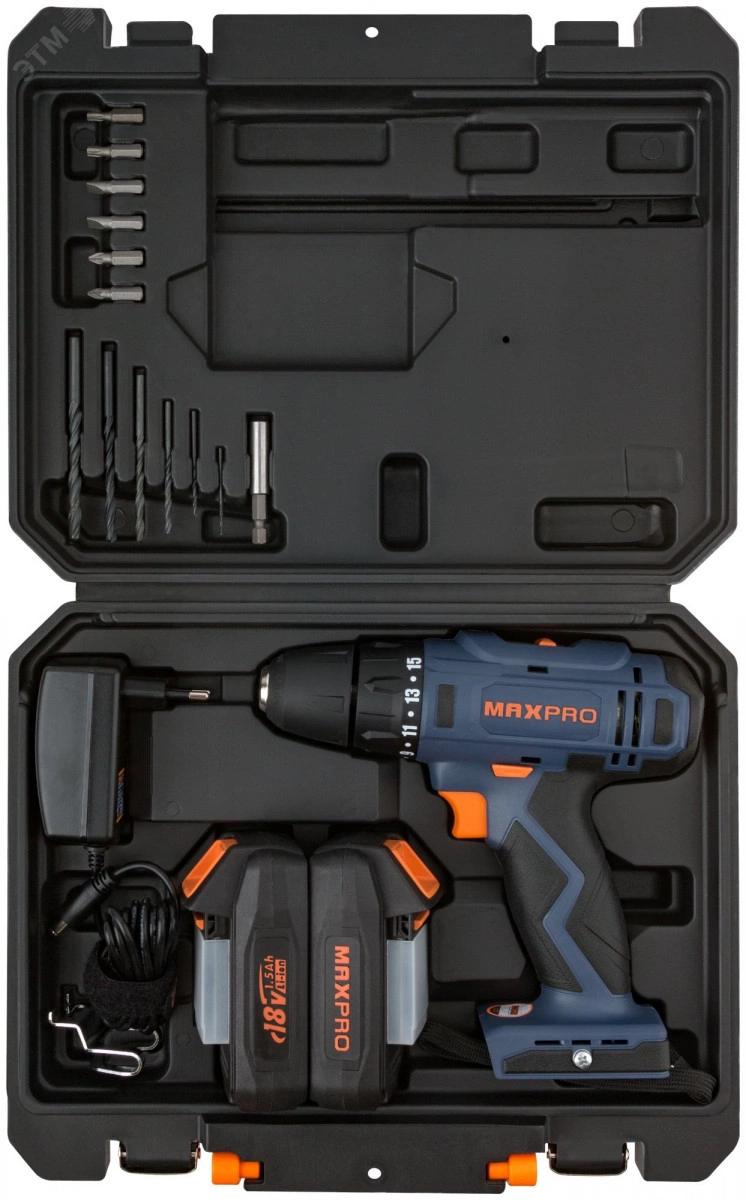 Дрель-шуруповерт аккумуляторная. 18 В, двухскоростной планетарный редуктор0-350/0-1250 об/мин, быстрозажимной патрон10 мм, максимальный крутящий момент 30 Нм,2 батареи (Li-Ion) x 1,5 Ач, регулировка крутящего момента 15+1, быстрая зарядка батареи 1 ч. Регулировка частоты вращения, реверс, резиновые вставки, LED подсветка, 1,3 кг, кейс.