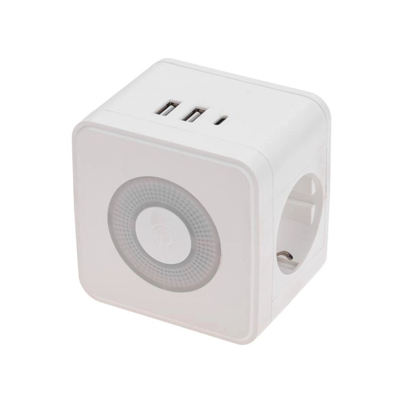 Двойник электрический Куб 16А с/з+2хUSB-A 2.4А+USB Type-C 3А с ночной подсветкой бел. Rexant 11-1251