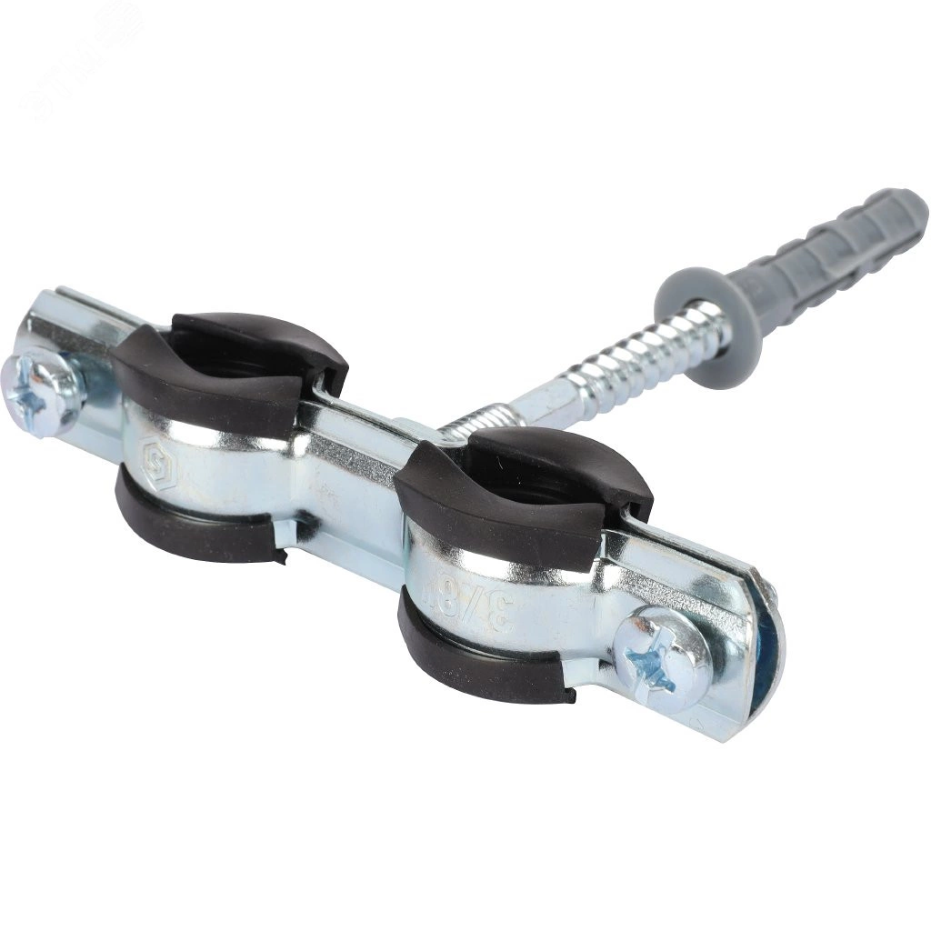 Полное описание: Двойной хомут для труб, комплект: хомут+шпилька шуруп +дюбель пластиковый 3/8'(15-19)