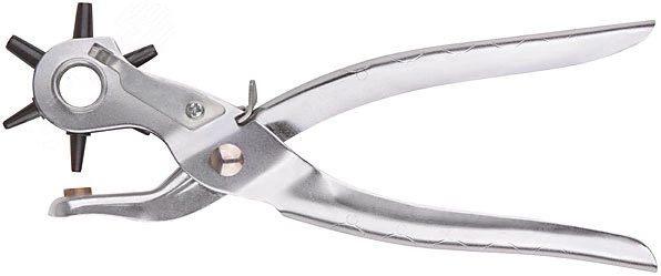 Дырокол-пробойник. С револьверной головкой. Для проделывания отверстий в картоне, пластике, текстиле, коже. Материал - инструментальная сталь с хромированным покрытием.
