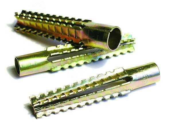 Металлический дюбель для газо (пено) бетона состоит из нераспорной цилиндрической шейки с распорной частью в виде четырех конусообразных сегментов с зубчатой поверхностью. Распорный металлический дюбель работает в паре с шурупами, саморезами, болтами или винтами.