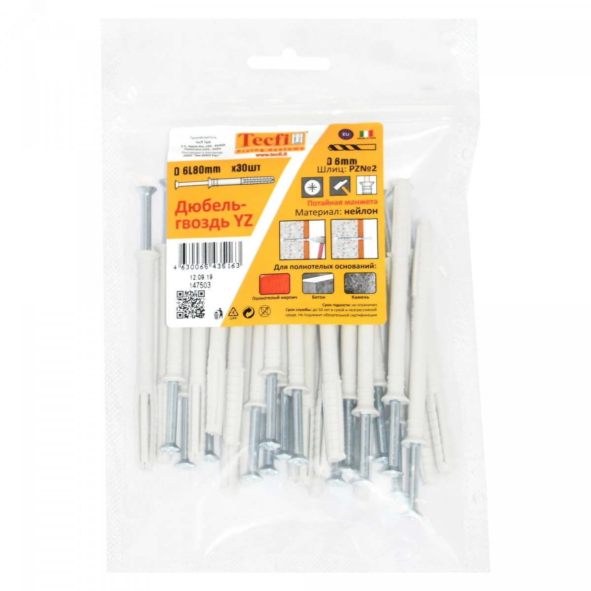 Дюбель-гвоздь YZ потайн. манжета нейлон 6x80 (30 шт) - пакет Tecfi