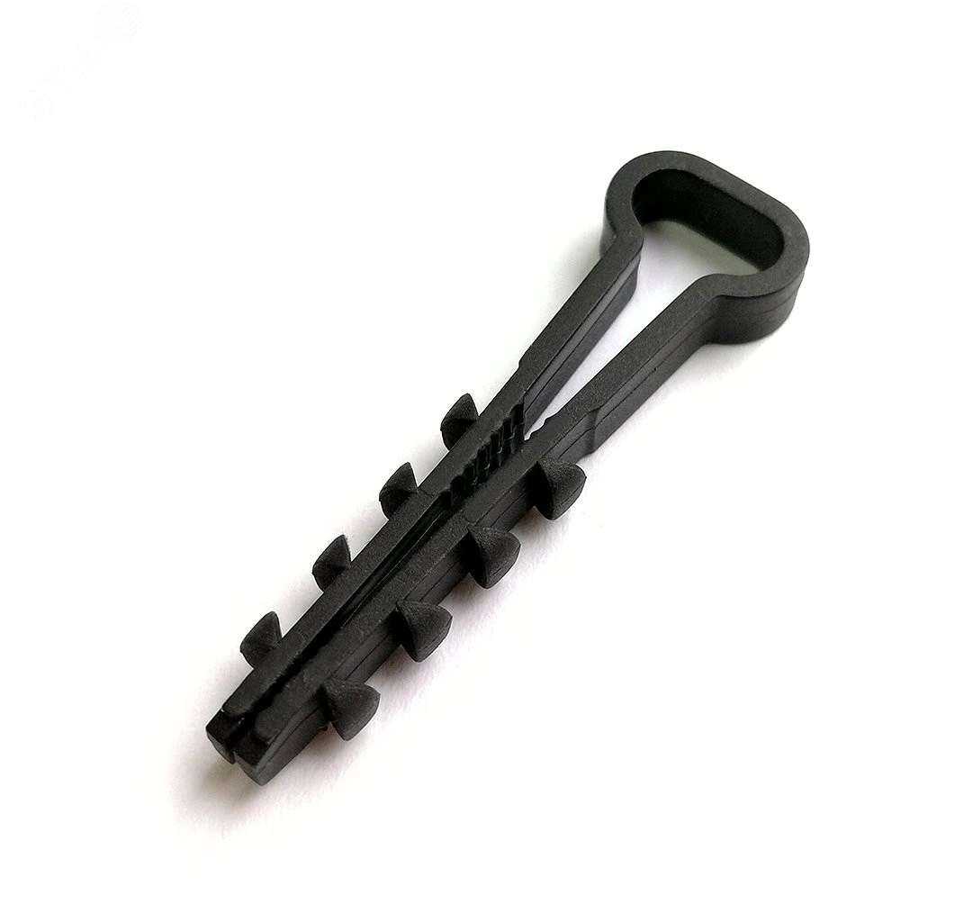 Дюбель-хомут производства ПЭМИ — это приспособления для быстрого и надёжного крепления плоского и круглого кабеля, металлорукава, гофрорукава, труб к гипсокартону, древесине, бетону, кирпичу, пенобетону и другим поверхностям. Упрощает процесс монтажных работ, заменяя дюбели и шурупы. Изготовлен из полимерного материала. Цвета: белые и черные. Дюбель-хомуты выполнены из морозостойкого пластика, с добавками устойчивыми к ультрафиолету и старению. Диапазон рабочих температур от -40 до +85 градусов, применяются как внутри, так и снаружи помещений. В модернизированной версии были добавлены `зубцы` на внутренних сторонах распорной зоны. Они не позволяют скользить распорным концам друг об друга, что еще больше облегчает монтаж кабеля. Дюбель-хомуты производства ПЭМИ, запатентованы в РОСПАТЕНТе как полезная модель.