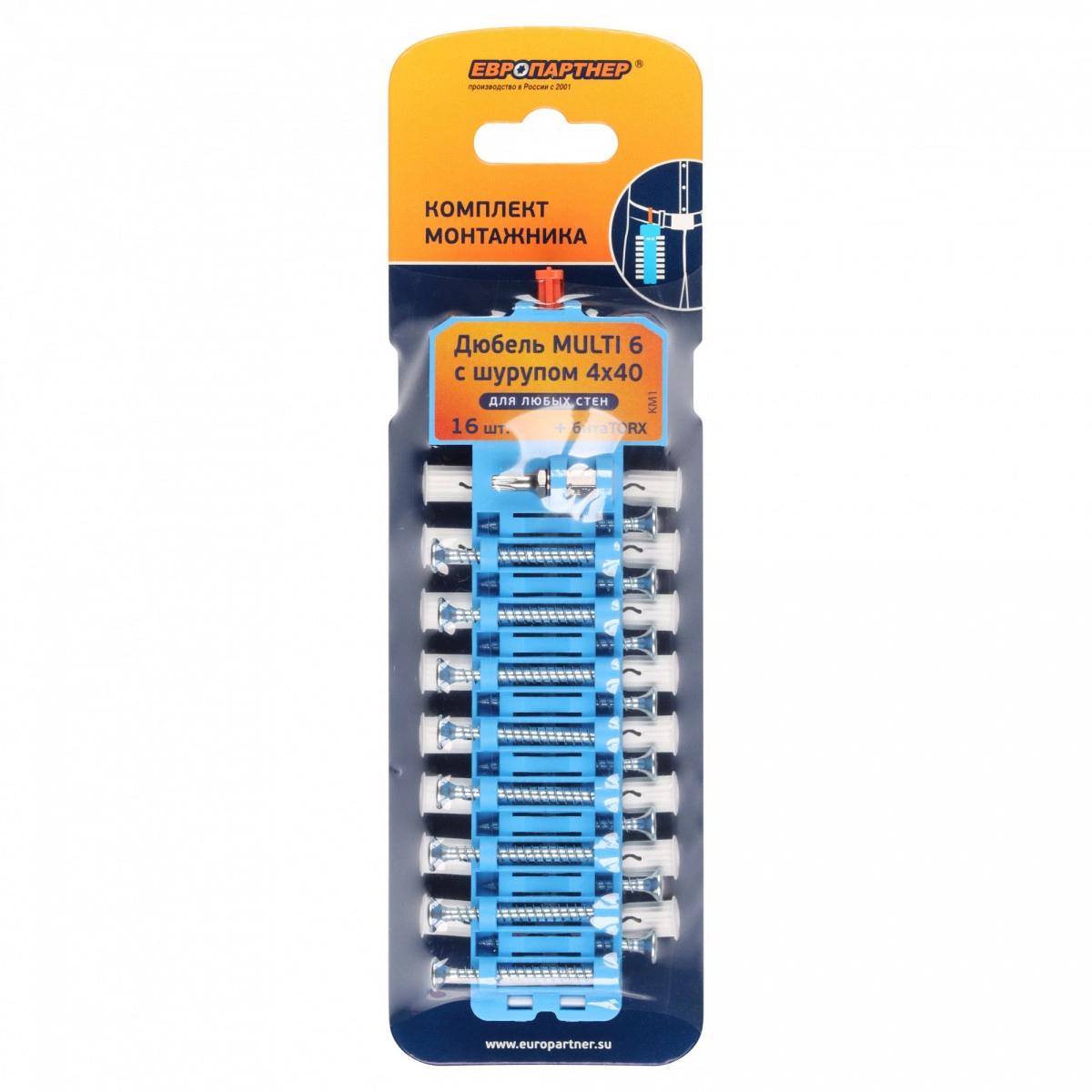 Комплект монтажника дюбель multi plug, шуруп multi screw, бита torx. Эластичный материал дюбеля multi plug позволяет осуществлять крепления в любые стены бетон, легкий бетон, газобетон, полнотелый, пустотелый кирпич, гипcокартон, пазогребневую и гипсолитовую плиты. Преимущества материал дюбеля, нейлон, устойчив к воздействию химических веществ и влаги, шестигранная форма дюбеля предотвращает проворачивание в стене, широкий, но тонкий фланец дюбеля препятствует продавливанию в стену, закаленный шуруп обеспечивает надежный и легкий монтаж, шлиц torx дает надежную фиксацию рабочего инструмента, а нормированное оцинкованное покрытие шурупа предохраняет от коррозии.