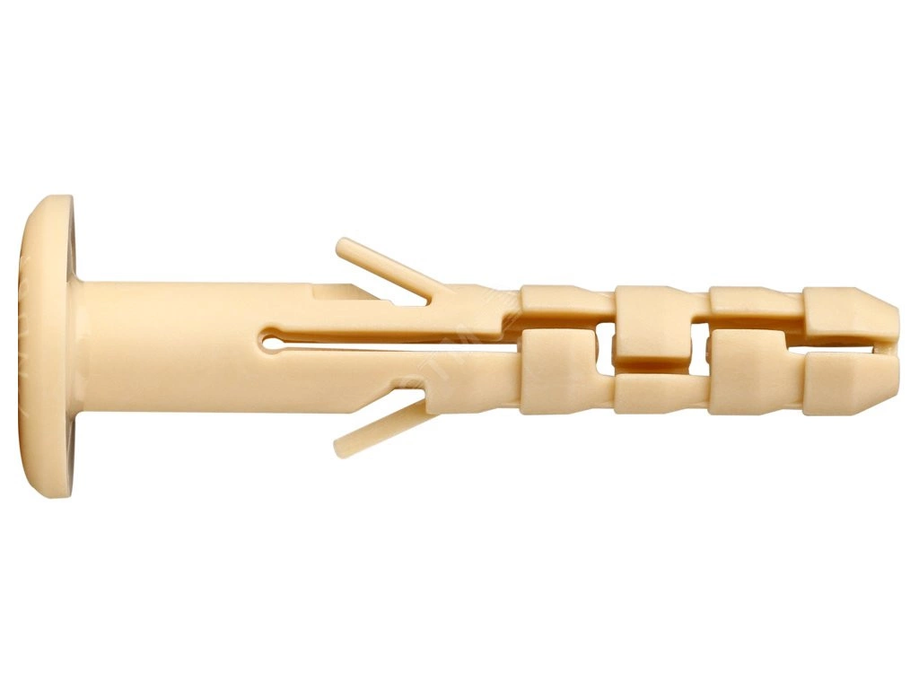 Дюбель PND - это распорный крепежный элемент, выполненный из нейлона. Конструкция дюбеля предполагает наличие элементов упорной фиксации, обеспечивающих сцепление с материалом, распорных элементов, предотвращающих прокручивание дюбеля в отверстии, перемычки, защищающей дюбель от преждевременного раскрытия при монтаже, широкого фланца, обеспечивающего лучшую фиксацию прикрепляемого материала. Его назначение – прочная фиксация компонентов конструкций, выполненных из пластика, древесины, металла к кирпичным, каменным и бетонным основаниям. Применяется для крепления металлокаркаса, направляющих для гипсокартона, металлических и деревянных стеллажей, натяжных потолков, щитового оборудования, кронштейнов и опор.