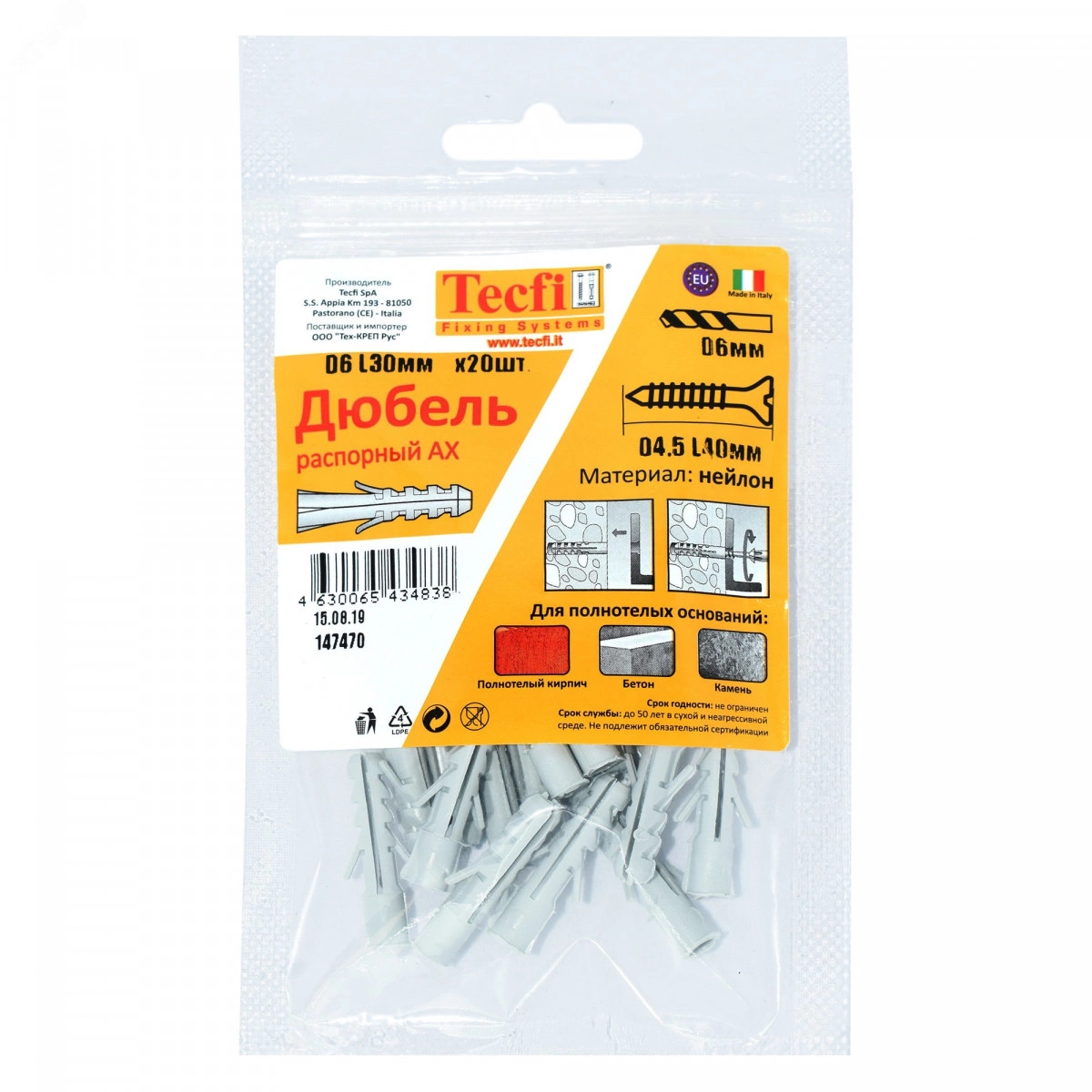 Дюбель распорный AX нейлон 6x30 (20 шт) - пакет Tecfi