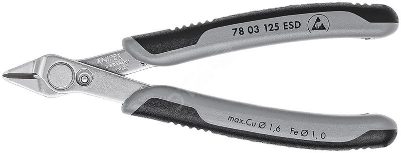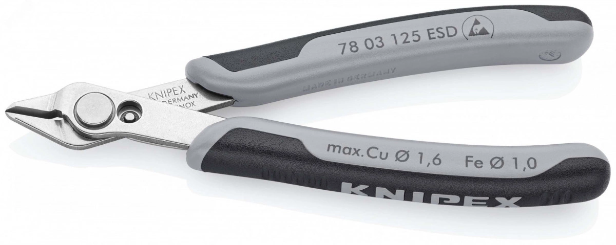Electronic Super Knips ESD кусачки прецизионные для самых тонких работ по резанию, например, в электронике и точной механике. ручки электроотводящие с рассеянием. шлифованные, очень острые режущие кромки без фасок. Рез с контролируемым смещением режущей кромки - для увеличениясрока службы и высокоточной резки самых тонких проводов. Прецизионные кончики режут заподлицо проволоку диаметром от 0,2 мм. шарнир с заклепкой из легированной стали. исключительно легкий ход для работы с минимальным утомлением. с раскрывающей пружиной и ограничителем раскрытия. режущие кромки дополнительно закалены токами высокой частоты до твердости примерно 64 HRC. INOX - инструментальная сталь