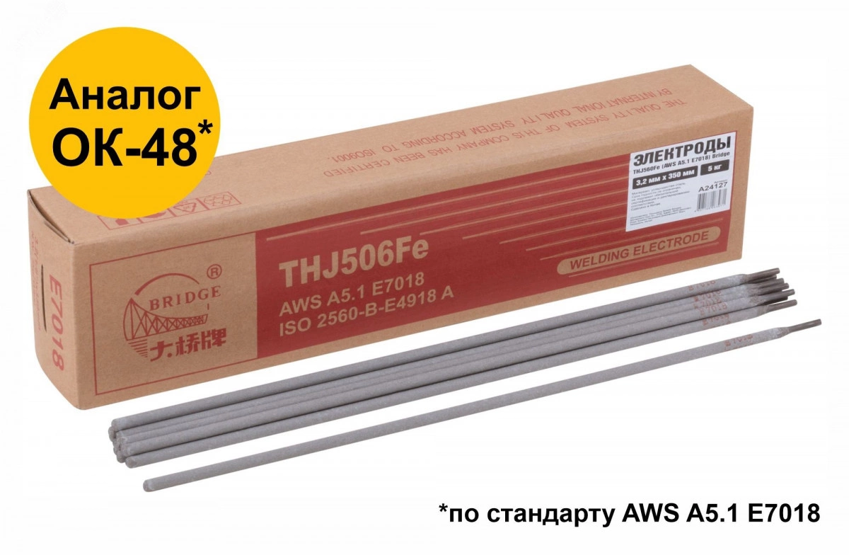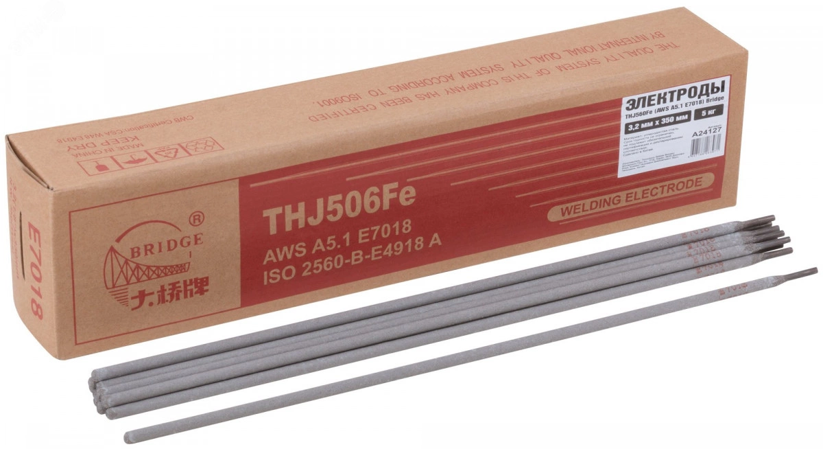 BRIDGE THJ506Fe — сварочный электрод, имеющий покрытие основного типа с низким содержанием водорода. Подходит как для переменного, так и для постоянного тока. Предназначен для сварки углеродистой стали и низколегированной стали, такой как Gr50, с классом прочности Q355. Имеет классификации - GB/T 5117 E5018, AWS A5.1 E7018, ISO 2560-B-E4918 A. Сварка позиций - PA, PB, PC, PD, PE, PF.
