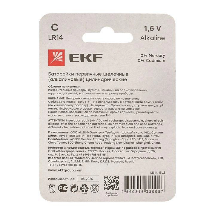 Полное описание: Элемент питания алкалиновый C/LR14 (блист.2шт) EKF LR14-BL2