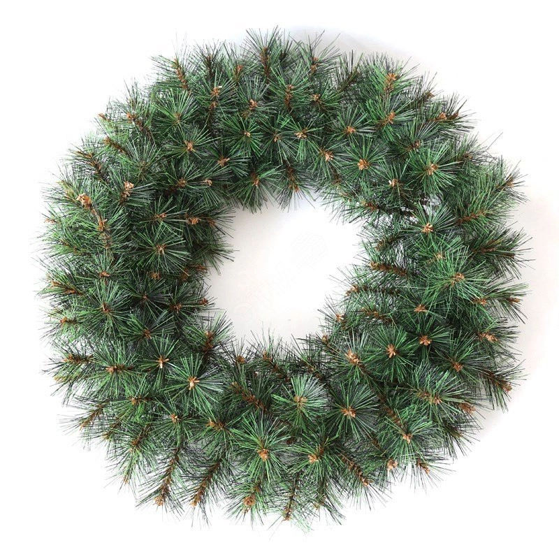 Еловый венок диаметром 60 см выполнен в виде молодых сосновых веточек, сплетенных в кольцо. Пушистая хвоя из лески смотрится максимально реалистично и прослужит более 5 лет, в отличие от натуральной елки. Можно использовать декоративное изделие как дома, так и на улице. Венок станет прекрасным украшением входной двери, окон, мебельных фасадов, стен. Пушистые ветки можно дополнить шарами, светодиодными фигурками, гирляндами и мишурой.