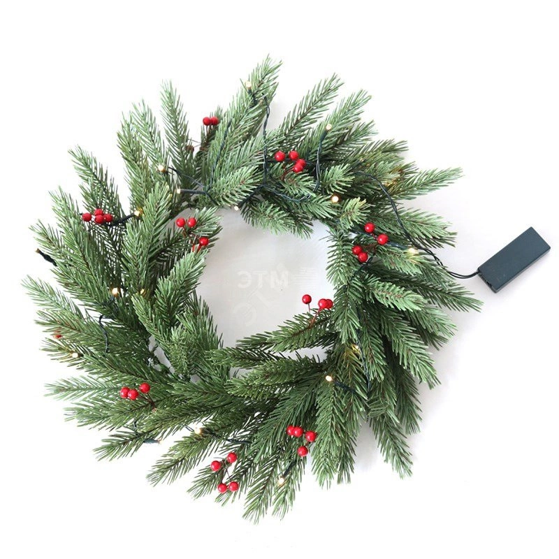 Еловый венок диаметром 45 см с ягодами и гирляндой — современный, эффектный и безопасный декор, который будет украшать ваш дом в Новый год много лет подряд. Изделие выполнено из мягкого, но прочного полимера — иголки не колются и не царапают кожу при прикосновении. Гирлянда со светодиодами красиво подсвечивает композицию, дополненную ярко-красными ягодами остролиста. Декоративный венок питается от 2 батареек типа АА, поэтому не нуждается в подключении к розетке — украшение можно повесить в любом месте.