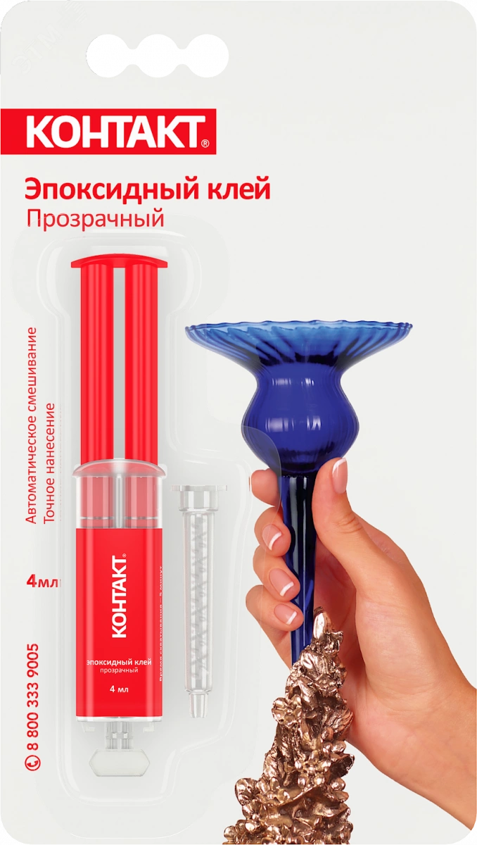 Двухкомпонентный прозрачный эпоксидный клей на основе полиэпоксидной смолы и отвердителя. Предназначен для различного домашнего ремонта. Отличается отсутствием необходимости смешивать компоненты эпоксидного клея в какой-либо ёмкости. Входящий в комплект смеситель с тонким носиком на конце позволяет наносить готовую смесь непосредственно на место склейки, точно и дозировано, аккуратно надавливая на поршень шприца. Время схватывания – 5 минут. Склеенные изделия можно эксплуатировать при температуре от -30С до +150С. Время жизнеспособности смеси 2–4 минуты после смешивания. Полное отвердевание клеевого шва происходит через 24 часа.