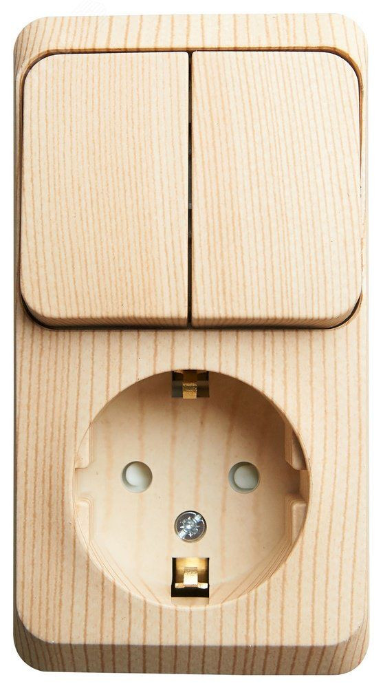 Блок Systeme Electric (ранее Schneider Electric) ЭТЮД (сосна, открытой установки) предназначен для применения в сетях до 250В, состоит из розетки на 16А с заземлением и шторками и двухклавишного выключателя на 10А. Две клавиши позволяют управлять двумя источниками света с одной точки. Он удобен в применении и отлично подходит для коридора. Изделия цвета Сосна обладают уникальным рисунком, напоминающим древесный сруб. Сделано в России.