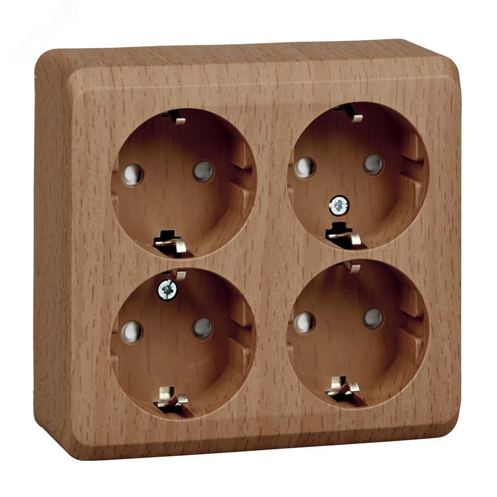 Розетка Systeme Electric (ранее Schneider Electric) ЭТЮД (бук, открытой установки) четырёхместная с заземлением и шторками предназначена для применения в сетях до 250В, на ток до 16А. Четырёхместная розетка позволяет подключить четыре устройства в одном месте. Шторки и заземление обеспечивают дополнительную безопасность при косвенных прикосновениях. Изделия цвета Бук обладают уникальным рисунком, напоминающим древесный сруб. Сделано в России.