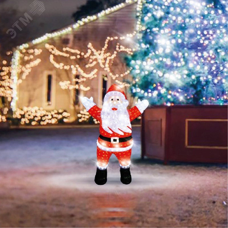 Акриловая светодиодная фигура NEON-NIGHT ''Приветствующий Санта Клаус'' высотой 120 см, светящаяся более чем 320 яркими диодами, выполнена по специальной технологии нанесения акрила. Она позволит вам создать ту самую, настоящую новогоднюю атмосферу и принести сотни радостных улыбок. Эти яркие, светящиеся объемные фигуры, состоящие из металлического каркаса, акрила и светодиодов, применяются для оформления и создания новогодней атмосферы в кафе, ресторанах, торговых центрах, магазинах, на площадях и перед входом, а также просто в частных домах и квартирах. Все фигуры укомплектованы понижающим трансформатором , что обеспечивает безопасность при контактировании, а также имеют степень защиты IP65, что позволяет использовать их как в помещении, так и на улице.
