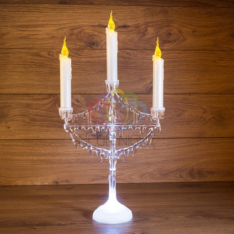 Фигура на подставке ''Подсвечник со свечками'' высотой 50 см — эффектный интерьерный декор, который не только гармонично украсит обстановку, но и станет полноценным функциональным предметом. 1 белый и 3 желтых светодиода создают эффект плавно движущегося огня на кончике фитилей. Питание от 3 мизинчиковых батареек (типа ААА). Композиция выполнена из белого и прозрачного пластика в виде подсвечника с 3 декоративными свечами. В нижней части подставки расположены батарейный модуль и кнопка ON/OFF.
