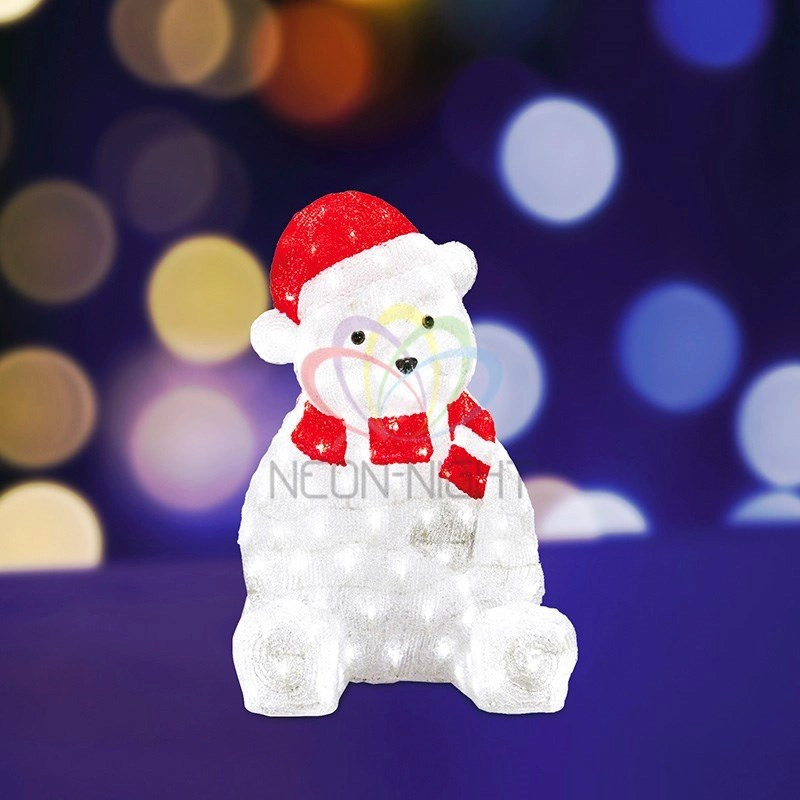 Эти яркие, светящиеся объемные фигуры, состоящие из металлического каркаса, акрила и светодиодов, применяются для оформления и создания новогодней атмосферы в кафе, ресторанах, торговых центрах, магазинах, на площадях и перед входом, а также просто в частных домах и квартирах. Все фигуры укомплектованы понижающим трансформатором , что обеспечивает безопасность при контактировании, а так же имеют степень защиты IP 65, что позволяет использовать их как в помещении, так и на улице. Акриловая светодиодная фигура ''Медвежонок в красном колпаке'' высотой 56 см, светящаяся более чем 200 ярких диодов, выполнена по специальной технологии нанесения акрила имитируя шерстяной покров реального животного. Новинка этого сезона позволит Вам создать ту самую, настоящую новогоднюю атмосферу и принести сотни радостных улыбок.