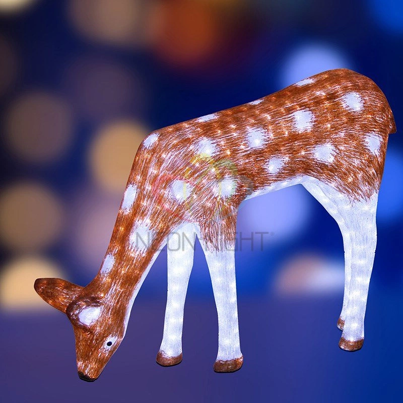 Эти яркие, светящиеся объемные фигуры, состоящие из металлического каркаса, акрила и светодиодов, применяются для оформления и создания новогодней атмосферы в кафе, ресторанах, торговых центрах, магазинах, на площадях и перед входом, а также просто в частных домах и квартирах. Все фигуры укомплектованы понижающим трансформатором , что обеспечивает безопасность при контактировании, а так же имеют степень защиты IP 65, что позволяет использовать их как в помещении, так и на улице. Акриловая светодиодная фигура ''Олень мама коричневая'' высотой 82 см, светящаяся более чем 2850 ярких диодов, выполнена по специальной технологии нанесения акрила имитируя шерстяной покров реального животного. Можно создать более интересную композицию, если составить всю семью коричневых оленей вместе (''Олень папа коричневый'' артикул 513-105 и ''Оленёнок коричневый'' 513-106)