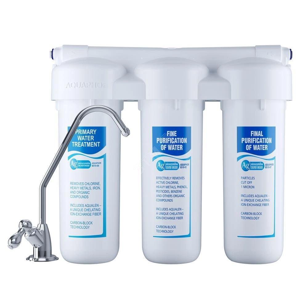 Фильтр Аквафор Трио Норма Умягчающий борется с жесткостью даже в мутной воде. Подойдет, если в чайнике регулярно появляется белый налет и неприятные хлопья, а водопроводная вода содержит механические примеси - ржавчину, ил, песок. Также эффективно удаляет хлор, тяжелые металлы, пестициды, нефтепродукты и другие распространенные загрязнители. Подает чистую питьевую воду на отдельный кран.