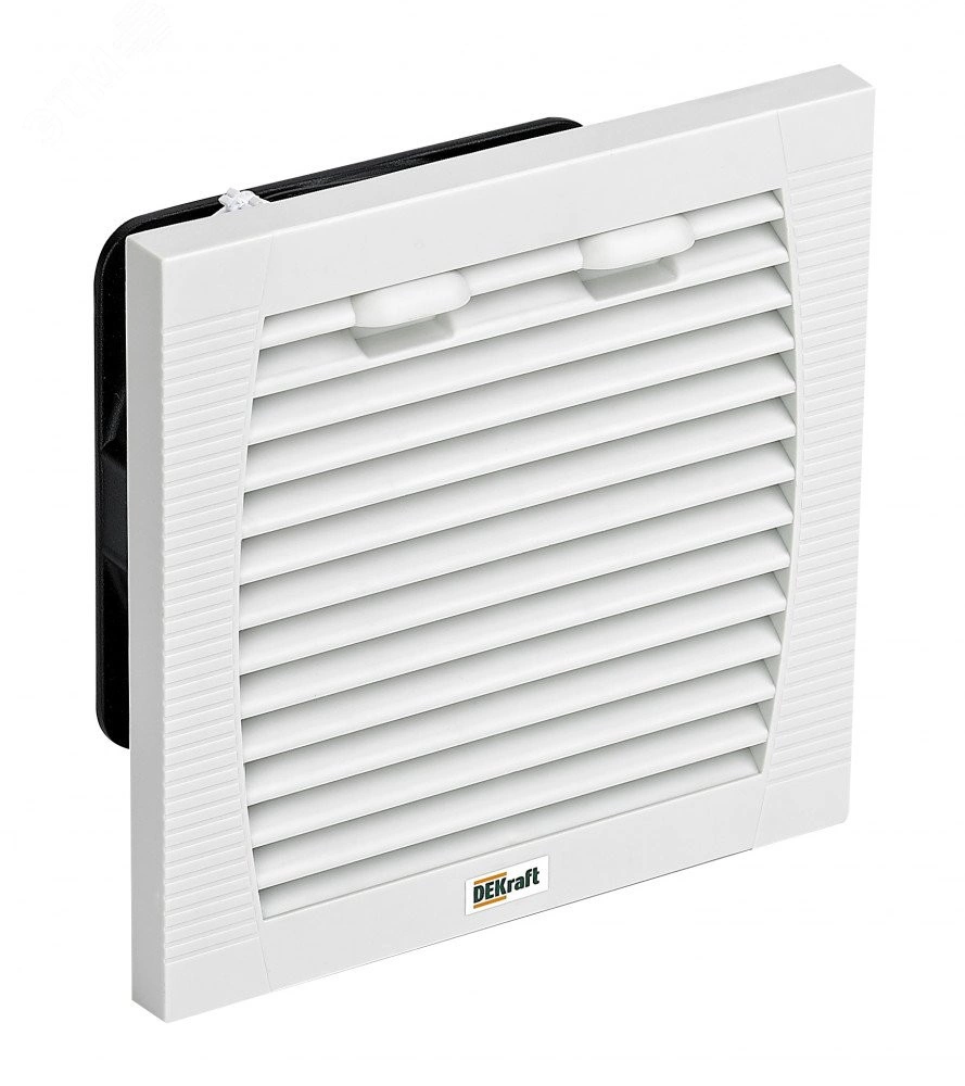 Вентилятор (с фильтром или без него) всасывает свежий воздух снаружи внутрь корпуса, создавая тем самым небольшое избыточное давление, которое приводит к удалению горячего воздуха через выпускную решетку. Циркуляция воздуха гомогенизирует температуру, а избыточное давление помогает предотвратить попадание пыли. Крепление сбоку или на крыше. Может комбинироваться с термостатом. Вентиляторы состоят из осевого двигателя, защитного кожуха на передней и задней поверхностях и фильтра, предназначенного для удержания частиц пыли. Этот фильтр может быть заменен во время работы без риска контакта с вращающимся элементом. Внешняя температура не должна превышать 35C и должна быть более чем на 5C ниже требуемой температуры в корпусе. Фильтры, которыми оснащены вентиляторы, необходимо регулярно чистить и заменять. При определении расхода вентилятора учитывайте потери давления, вызванные выпускным элементом (решеткой с фильтром, вентиляционной решеткой или простым отверстием).
