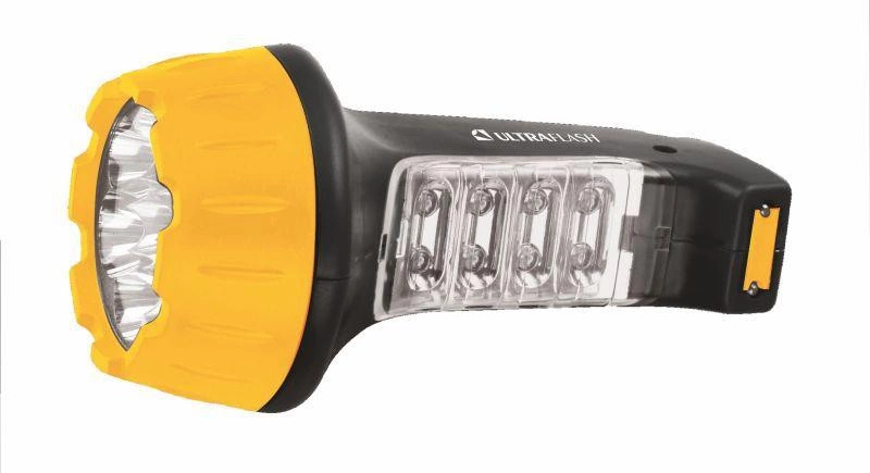 Фонарь Ultraflash электрический светодиодный аккумуляторный. Цвет корпуса: черный + желтый. Материал корпуса - пластик. Источник света - 7 светодиодов в индивидуальных отражателях со световым потоком 25 люмен - в отражателе, 8 светодиодов - в плафоне. Дистанция освещения - до 25 метров. Два режима работы. Выключатель - тумблер двухпозиционный. Время работы при полностью заряженном аккумуляторе: 7 светодиодов в отражателе - до 7 часов, 8 светодиодов в плафоне - до 7 часов. Заряд напрямую от сети ~220 вольт. Время заряда 8 ч. Комплектация: фонарь, свинцово-кислотный аккумулятор с напряжением 4 В емкостью 0,7 А-ч, светодиодный индикатор заряда, выдвижная сетевая вилка, инструкция, упаковка. Степень пыле-влаго-защиты IP22. Упаковка - коробка. Максимальный линейный размер фонаря 15 см. Размер упаковки 8 см x 16 см x 8,5 см. Вес без упаковки 0,170 кг. Вес с упаковкой 0,2 кг.