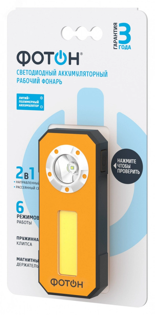 Фонарь аккумуляторный светодиодный ФОТОН из серии ''Рабочий свет'' - это многофункциональное компактное устройство для освещения в мастерской, гараже или в любом другом месте, где требуется яркая подсветка. Фонарик обеспечивает заполняющий свет, имеет большое количество режимов работы и фиксируется на металлических поверхностях, благодаря магнитному держателю. Высококачественные светодиоды обеспечивают яркое и равномерное освещение на значительные расстояния. Благодаря встроенному аккумулятору вы сможете заряжать устройство от сети. Фонарь идеально подходит для туристов, путешественников, рыболовов и охотников. Удобство и легкость фонаря делают транспортировку максимально комфортной, а прочный корпус защищает от ударов и падений. Различные режимы освещения позволяют настроить яркость в зависимости от ситуации — от экономного режима для продолжительного использования до супер яркого луча для максимальной видимости.