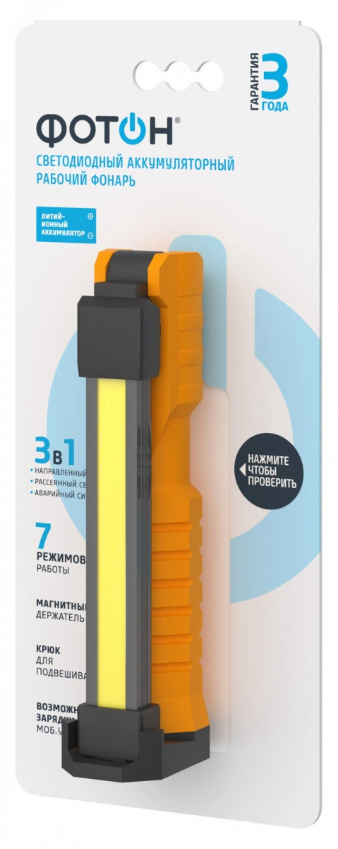 Фонарь аккумуляторный светодиодный ФОТОН из серии ''Рабочий свет'' - это многофункциональное компактное устройство для освещения в мастерской, гараже или в любом другом месте, где требуется яркая подсветка. Фонарик обеспечивает заполняющий свет, имеет большое количество режимов работы и фиксируется на металлических поверхностях, благодаря магнитному держателю. Этот мощный фонарь также идеально подойдет для кемпинга, рыбалки, охоты или любого другого активного отдыха на свежем воздухе. Фонарь оснащен высококачественными светодиодами, которые обеспечивают яркое и равномерное освещение. Его прочный корпус защищен от влаги и пыли. Встроенный аккумулятор обеспечивает длительное время работы. Возможность зарядки мобильных устройств и крючок для подвешивания повышает комфорт использования фонарика. Легкий и эргономичный дизайн позволяет легко носить фонарь с собой, а простая система управления делает его использование интуитивно понятным.