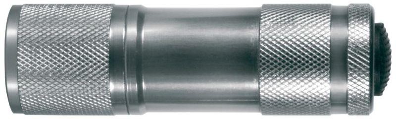 Фонарь Ultraflash электрический светодиодный. Цвет корпуса - металлик. Работает от батареек 3 X ААA (не входят в комплект). Материал корпуса - алюминиевый сплав. Источники света - 9 светодиодов (с рассеивающими линзами) с цветовой температурой 6500К с общим световым потоком до 20 люмен. Осевая сила света одного светодиода - 11000 милликанделл. Дистанция освещения - до 22 метров. Выключатель - кнопочного типа (с защитной резиновой накладкой) в задней части фонаря. Время работы при использовании солевых батареек: до 25 часов. Комплектация: фонарь, ремешок для переноски, инструкция, упаковка. Степень пыле-влаго-защиты IP64. Упаковка: коробка. Максимальный линейный размер фонаря 9,7 см. Размер упаковки 3 см x 10 см x 3 см. Вес без упаковки 0,049 кг. Вес с упаковкой 0,057 кг.
