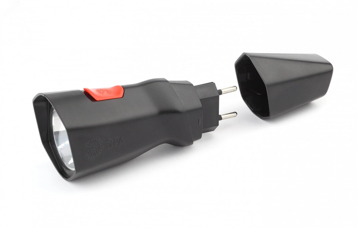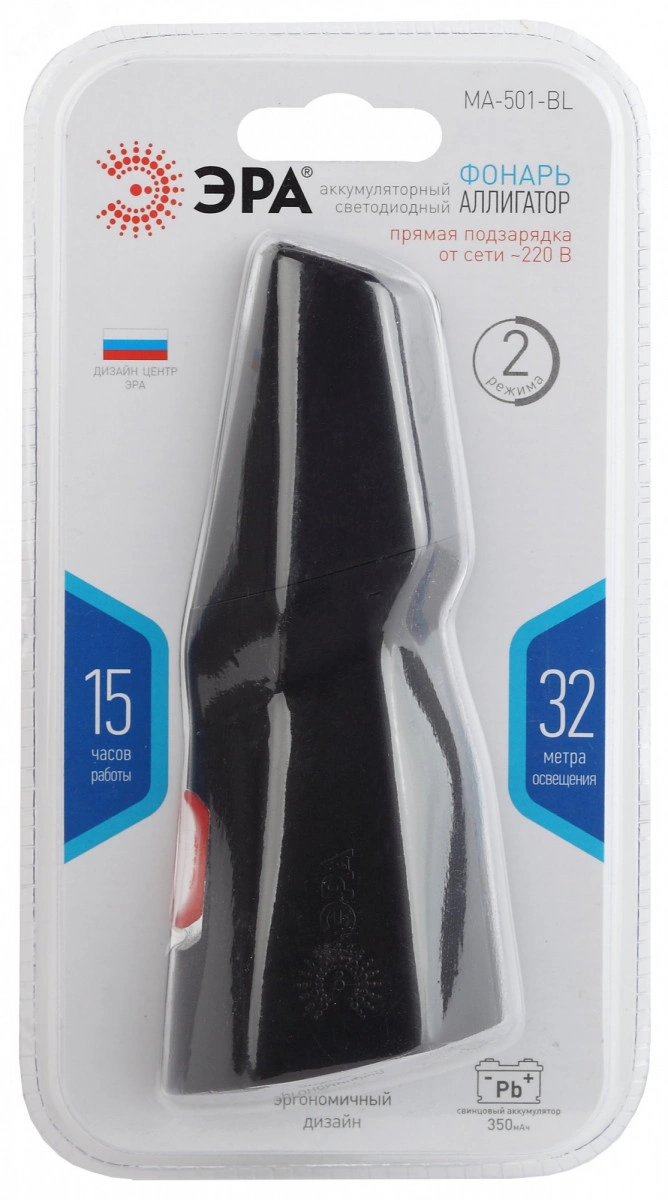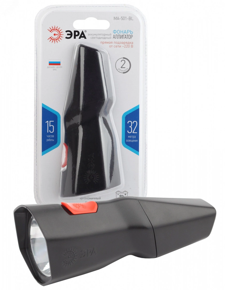 ЭРА MA-501 Аллигатор - удобный ручной фонарь собственной разработки ЭРА. Поставляется в презентабельной коробке, демонстрирующей необычный дизайн устройства. Эргономичный корпус имеет несколько граней. Фонарь отлично лежит в руке, яркая кнопка включения расположена прямо под большим пальцем. ЭРА МА-501 напрямую заряжается от электросети 220 В - не нужно брать с собой ни батарейки, ни провода для подзарядки. Вилка встроена прямо в корпус, достаточно просто снять с неё специальную защитную крышку и вставить фонарь в розетку. От одной подзарядки прибор проработает без перерыва 15 часов этого с запасом хватит на целую ночь или многодневное путешествие, если включать фонарь на несколько часов по вечерам.