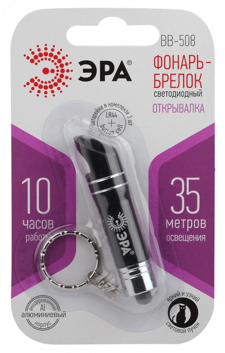 ЭРА BB-508 `ОТКРЫВАЛКА` - компактный светодиодный фонарь-брелок со встроенной открывалкой. Эргономичный и функциональный, им удобно и приятно пользоваться. Три LED-элемента последнего поколения создают яркий и ровный белый свет. Для небольшого карманного фонарика ЭРА ВВ-508 обладает высокой дальностью светового луча 35 метров. Батарейки поставляются в комплекте (3 х LR44), их хватает на 10 часов непрерывного свечения. Корпус изготовлен из прочного анодированного алюминия, на котором не появляются царапины и сколы.