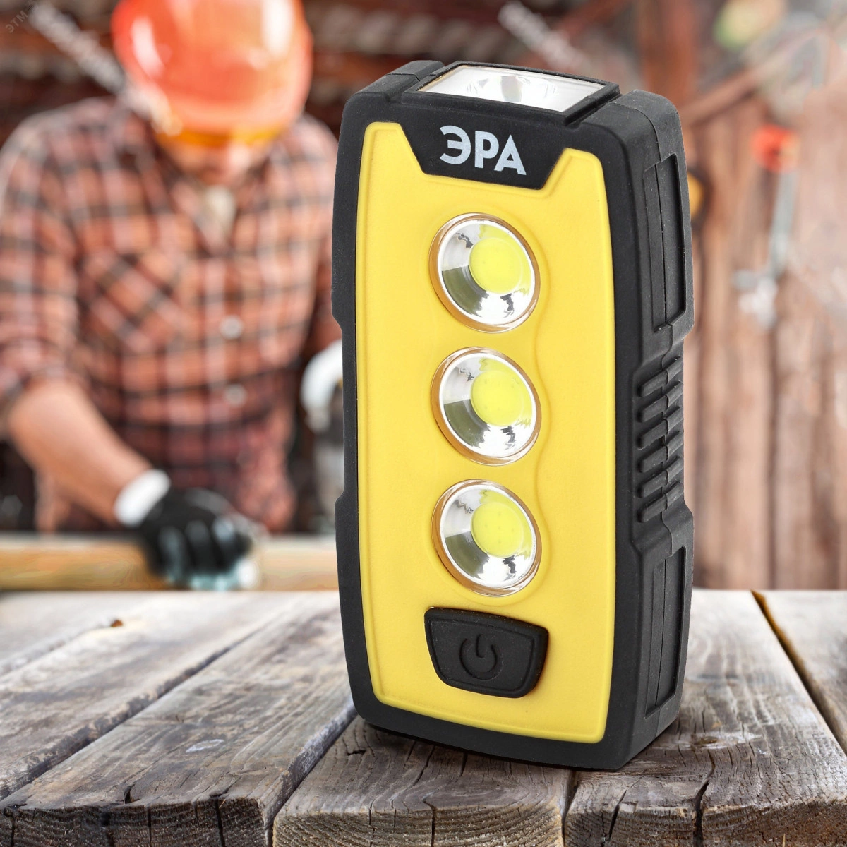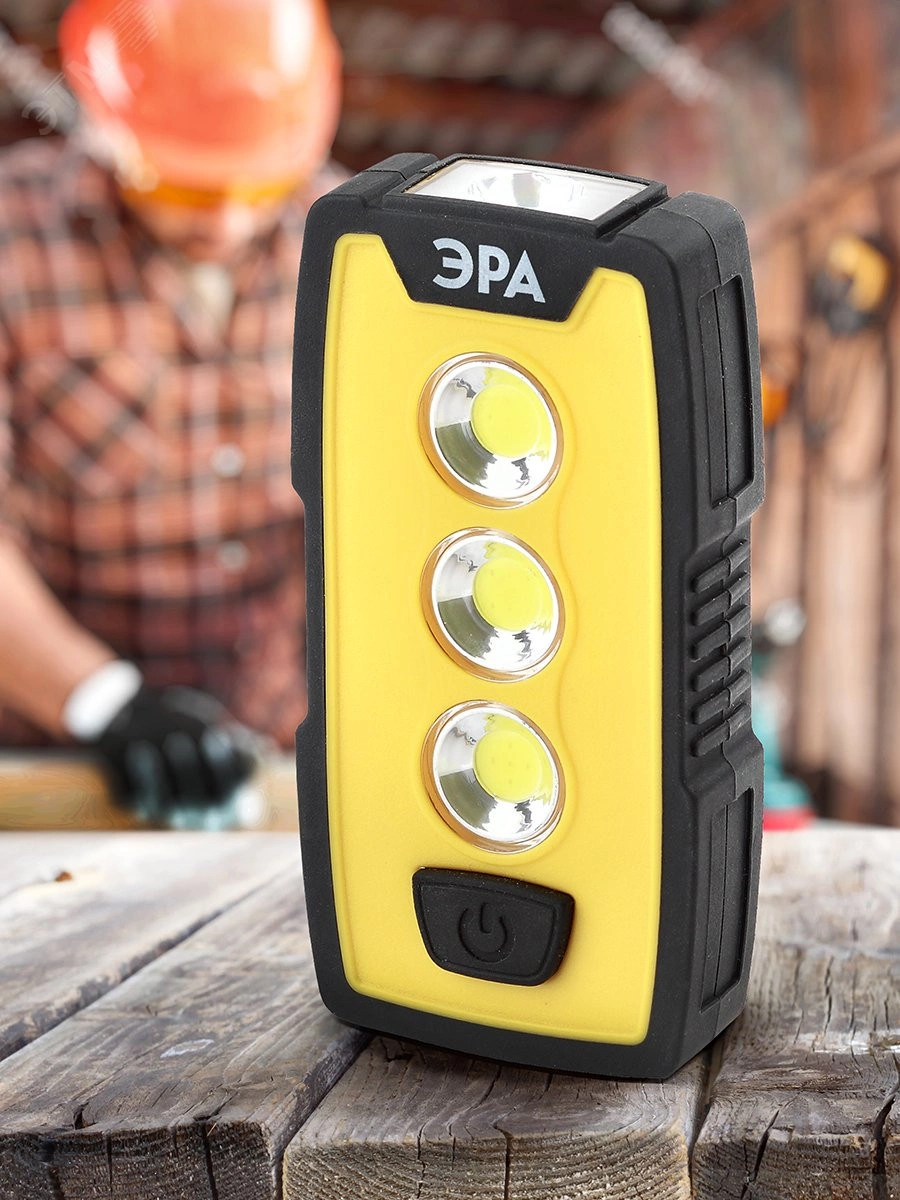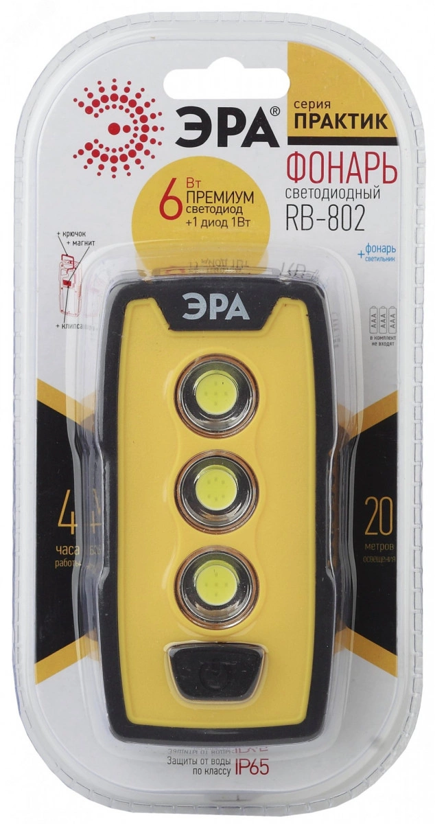 ЭРА RB-802 яркий светодиодный фонарь, который не боится воды (IP65 - защита от дождя и брызг). По периметру корпуса - прорезиненное покрытие, которое защищает устройство при возможных падениях и тряске. На лицевой стороне - 3 премиум-светодиода общей мощностью 6 Вт. Каждый из них расположен в индивидуальном гнезде - в случае повреждения одного из элементов, пользователь не останется без света. На торце - дополнительный LED-элемент мощностью 1 Вт. RB-802 можно использовать в двух режимах: направленный свет (фонарь с дальностью 20 метров) и рассеянный заливающий свет (светильник). Встроены три вида крепления к разным поверхностям - крючок, магнит и клипса. ЭРА RB-802 непрерывно работает без подзарядки в течение 4 часов.