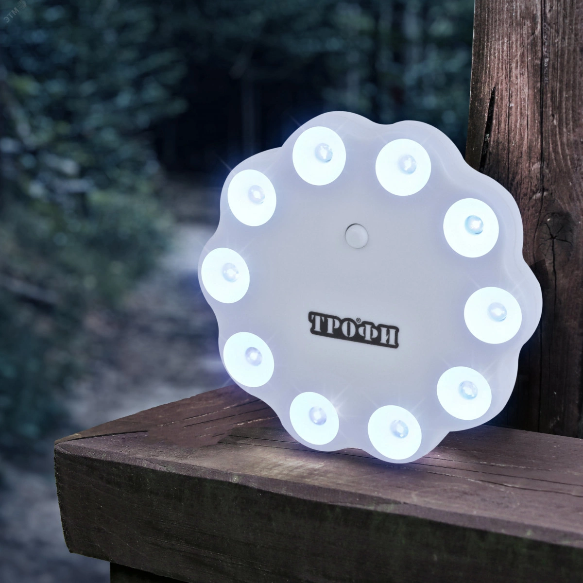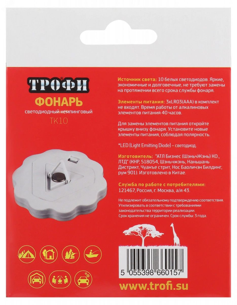 Трофи TK10 - кемпинговый LED-фонарь с несколькими типами креплений на разные поверхности. Фонарик можно использовать в качестве походного светильника или люстры. 10 ярких светодиодов эргономично расположены по кругу, за счет чего обеспечивается качественный ровный свет. Корпус изготовлен из ударопрочных материалов, устойчив к возникновению механических повреждений при возможных падениях или ударах. Его форма выполнена в виде плоского `цветка` - это существенный бонус, который позволяет экономить пространство при транспортировке. Светодиоды также имеют защиту: они вдавлены в корпус, каждый из них расположен в отдельном `гнезде`. При внезапной поломке нескольких LED элементов сразу другие продолжат работу и обеспечат нужный свет. Трофи TK10 - это многофункциональный кемпинговый фонарь, способный сделать максимально комфортной вашу жизнь на привале или во время отдыха на природе!