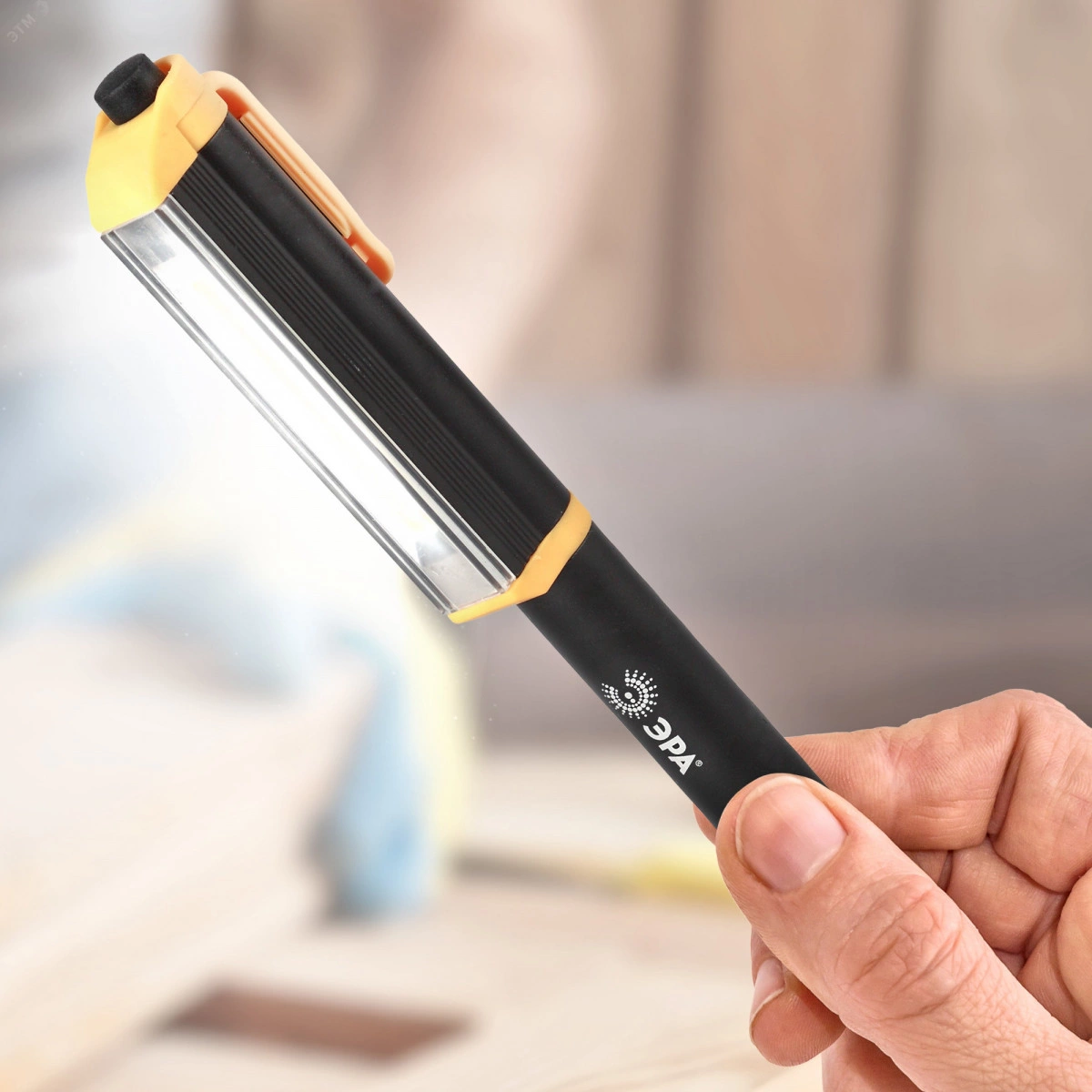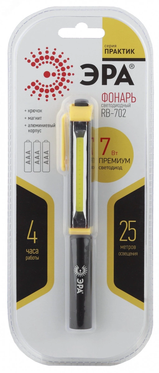 ЭРА RB-702 - фонарь-''ручка'' с корпусом из чистого алюминия. Этот портативный осветительный прибор настолько компактен, что напоминает аккуратную шариковую ручку. Его удобно прикрепить к карману куртки за специальный держатель. При своей миниатюрности ЭРА RB-702 обеспечивает ярчайший качественный свет. В его основе светодиоды COB - ''chip on board'' - ''кристалл на плате''. Разработанную для промышленного освещения технологию адаптировали для универсальных фонарей - так получился мощный и при этом ровный и мягкий свет.Еще один способ использовать ЭРА RB-702 ''без рук'' - закрепить его на любой металлической поверхности при помощи встроенного магнита. Установив 3 батарейки ААА, вы получите полные 4 часа непрерывной работы фонаря и 25 метров освещения.
